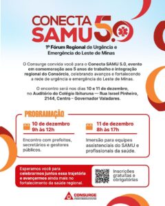 O Consórcio Intermunicipal de Saúde da Rede de Urgência e Emergência do Leste de Minas (Consurge) promove, nos dias 10 e 11 de dezembro, no auditório do Colégio Ibituruna, localizado na Rua Israel Pinheiro, 2144, Centro, em Governador Valadares, a 1ª edição do Conecta SAMU 5.0 — o 1º Fórum Regional de Urgência e Emergência do Leste de Minas, um marco que celebra os cinco anos de implementação do Consurge e consolida um novo movimento de integração, qualificação e fortalecimento do atendimento pré-hospitalar em toda a região.